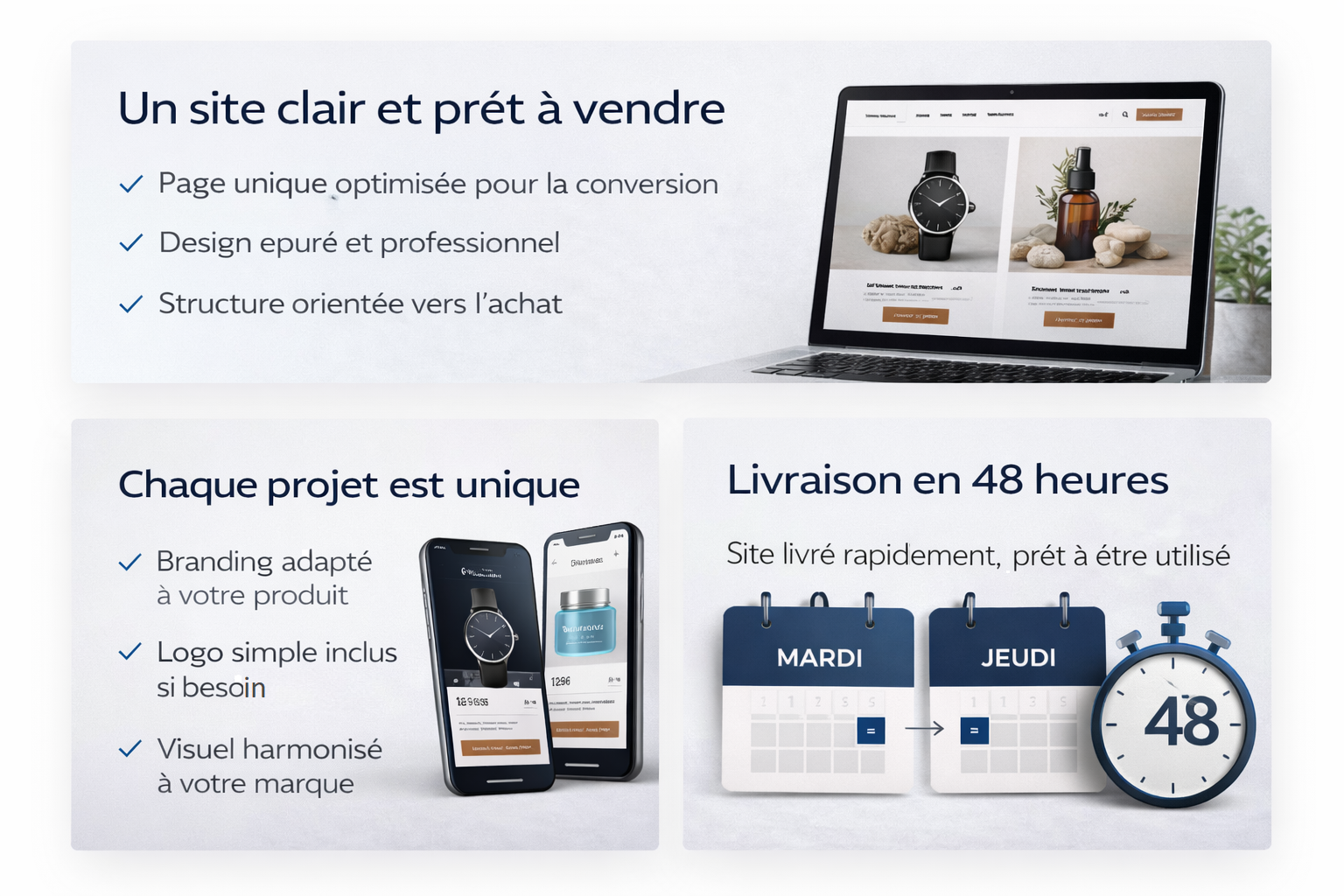 Nous concevons des sites e-commerce essentiels 1 à 2 produits, rapides et performants, pensés par une équipe dédiée pour transformer un produit en ventes concrètes.